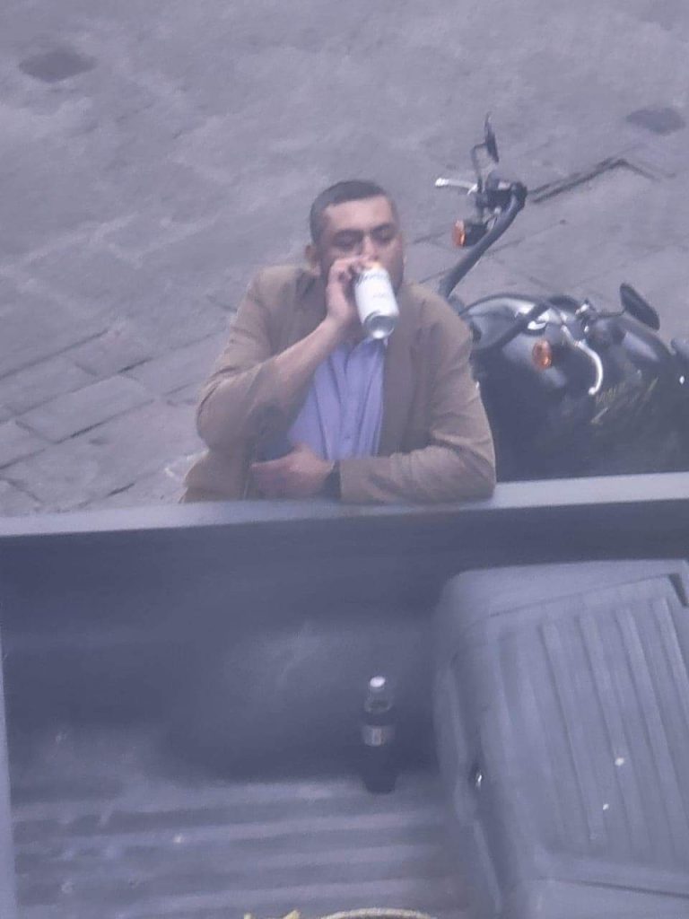 De acuerdo con testigos el sujeto que se ve en las fotografías caminando junto a una motocicleta de policía vial de la capital, estaba totalmente ebrio y aparentemente conocía a los oficiales que le brindaron la caja de la patrulla, para que pudiera disfrutar su cerveza.