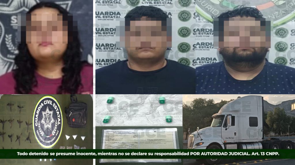 La Guardia Civil Estatal (GCE) detuvo a tres personas en los municipios de Villa de Reyes y Ciudad Valles, por presuntos delitos contra la salud, como parte de la Estrategia Integral de Seguridad implementada en las cuatro regiones del Estado.