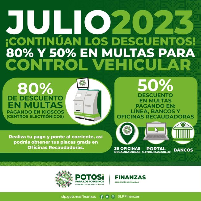 En San Luis Potosí sí hay apoyo a la economía familiar, por lo que durante el mes de julio el Gobierno del Estado, a través de la Secretaría de Finanzas (Sefin), aplicará el 80 por ciento de descuento en multas de control vehicular pagando en centros electrónicos (kioscos), y el 50 por ciento para quienes realicen el pago en línea, bancos u oficinas recaudadoras.
