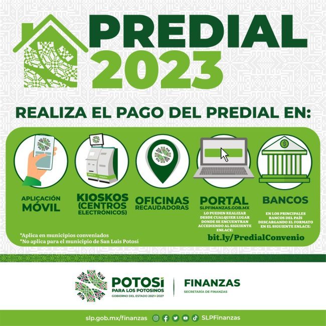 “Las y los potosinos tendrán una amplia posibilidad para realizar sus pagos, en cualquier oficina recaudadora del Estado y en los principales bancos, mediante formato emitido por la dependencia”, explicó González Martínez, al detallar que los pagos también se pueden realizar en línea en la página de Finanzas, por la aplicación en celulares o dispositivos electrónicos y en los Kioscos.
