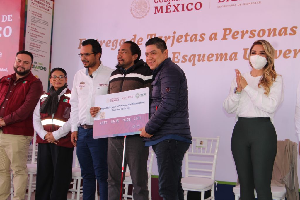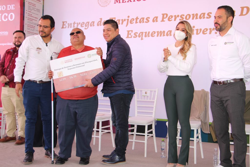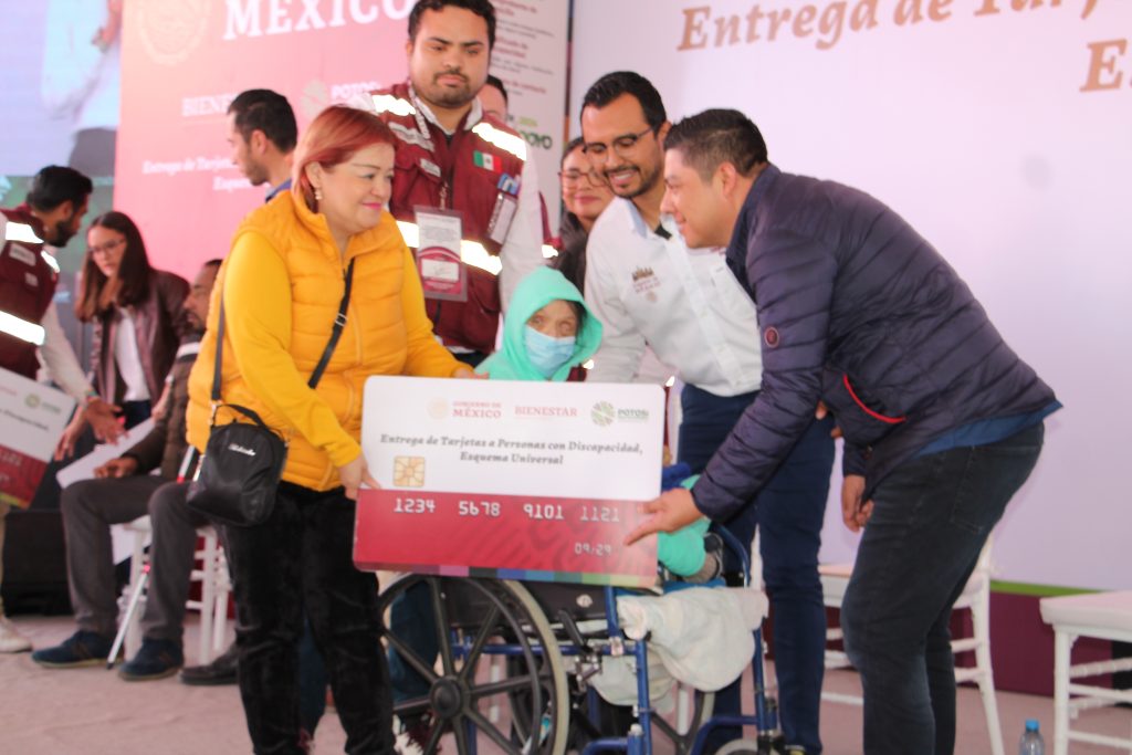 Acompañado por la presidenta honoraria del Sistema Estatal para el Desarrollo Integral de la Familia (DIF), Ruth González Silva, en las instalaciones del Centro de Rehabilitación y Educación Especial (CREE), Gallardo Cardona entregó tarjetas de pensión y destacó que las y los potosinos con discapacidad, tendrán el derecho de este apoyo, ya que se blindará en la Constitución del Estado; también agradeció al Gobierno del Presidente López Obrador, por este esfuerzo que brindará bienestar a las familias potosinas.