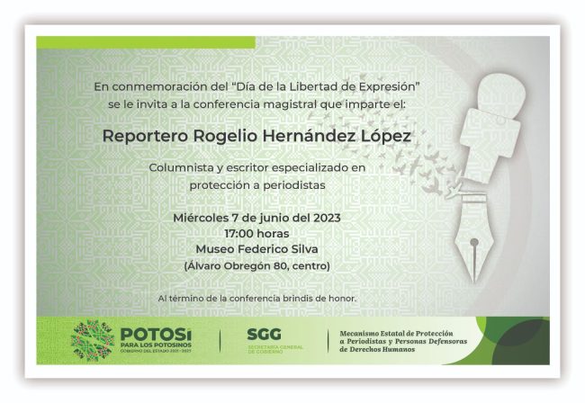 En el marco del Día de la Libertad de Expresión, la Secretaría General de Gobierno (SGG) y del Mecanismo Estatal de Protección a personas Defensoras de Derechos Humanos y Periodistas, presentarán, este 07 de junio en el museo Federico Silva, la conferencia magistral “Protección integral para periodistas y autoprotección”, a cargo de Rogelio Hernández López, reportero de una amplia trayectoria a nivel nacional.