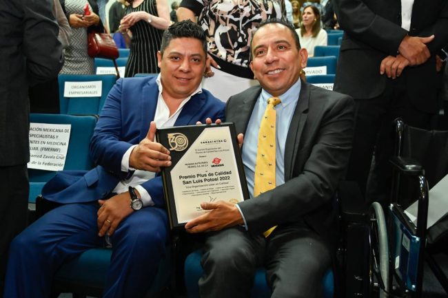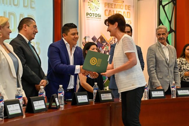 Junto al presidente local de Canacintra, Gerardo Bocard Meraz, Gallardo Cardona, entregó el premio de Calidad “San Luis Potosí 2022”, por el establecimiento de sistemas de calidad en las organizaciones pública y privadas que impactan en la vida de la ciudadanía y la comunidad, a través de programas en desarrollo económico, educación, medioambiente y causas sociales.