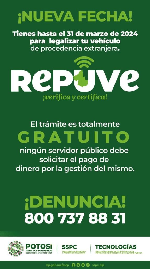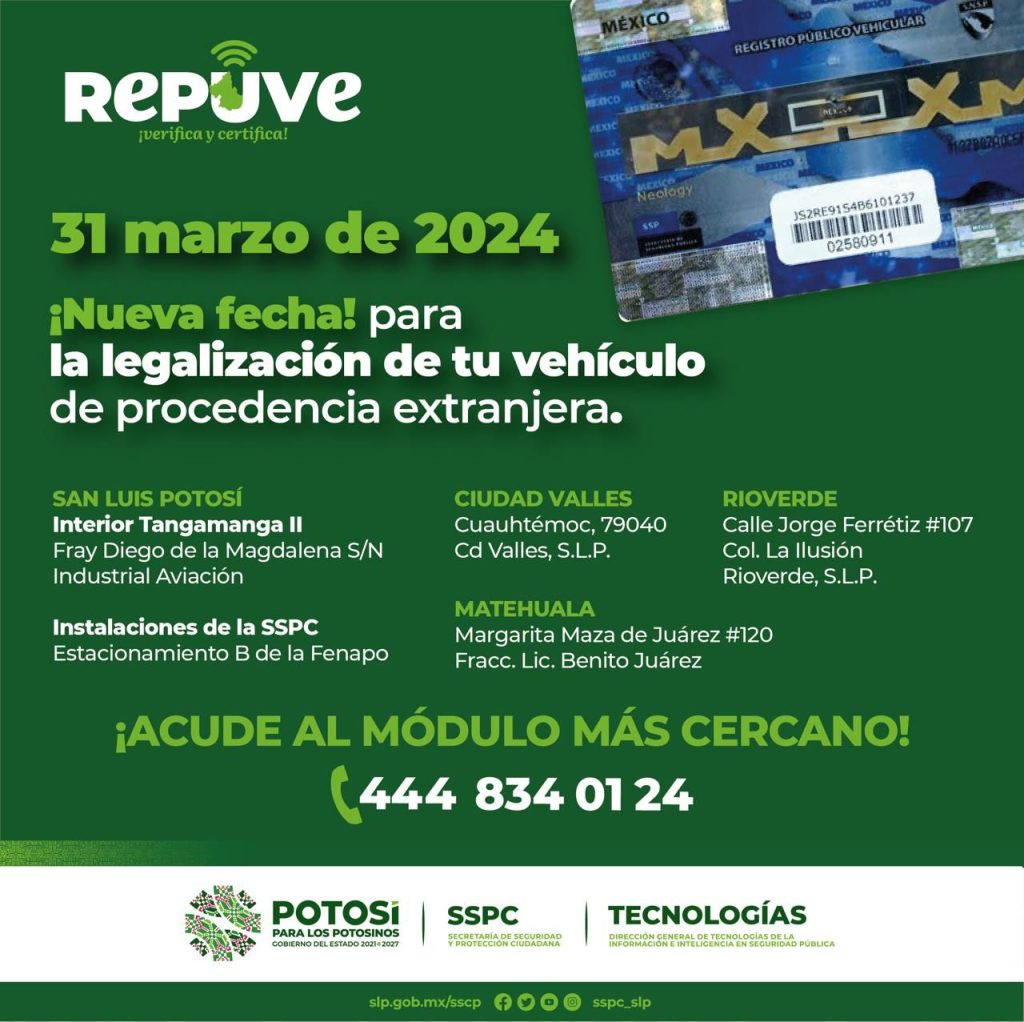 El Gobierno del Estado a través de la Secretaría de Seguridad y Protección Ciudadana, informa que con base a un reciente decreto federal publicado en el diario oficial, se amplia el plazo para la regularización de vehículos de procedencia extranjera hasta el 31 de marzo del 2024.