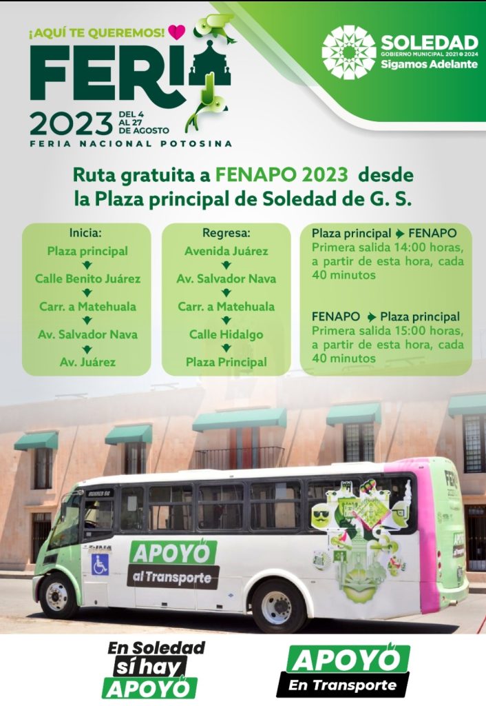 En apoyo a la economía de las familias soledenses, y para incentivar a que sean parte de la edición 2023 de la Feria Nacional Potosina, se brinda transporte gratuito desde la plaza principal del municipio hasta las instalaciones feriales.