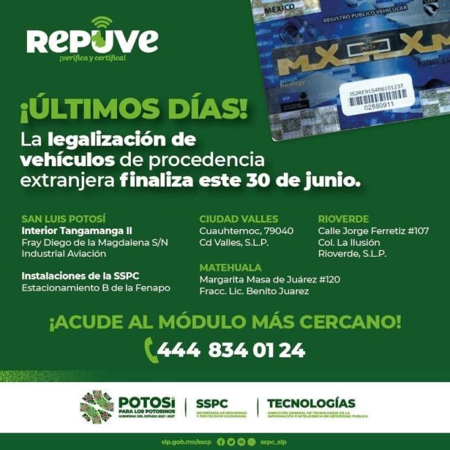 Destacó que el servicio para las y los potosinos se vio fortalecida en los distintos módulos ubicados en el estado para la tramitación del Registro Público Vehicular (REPUVE), en la capital potosina, así como en los municipios de Ciudad Valles, Matehuala y Rioverde.