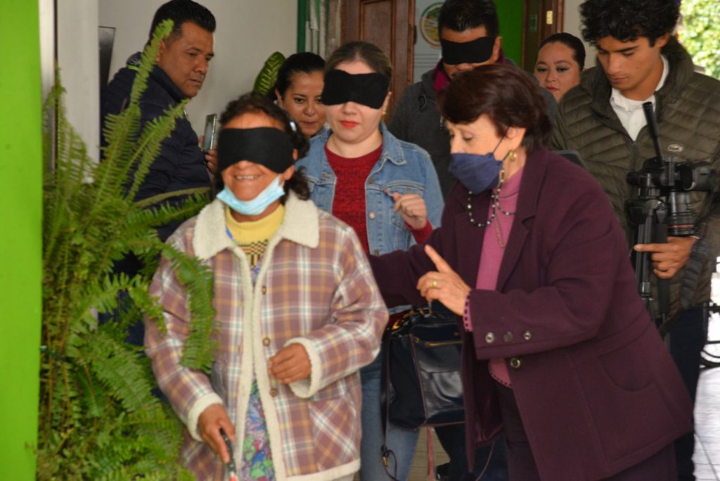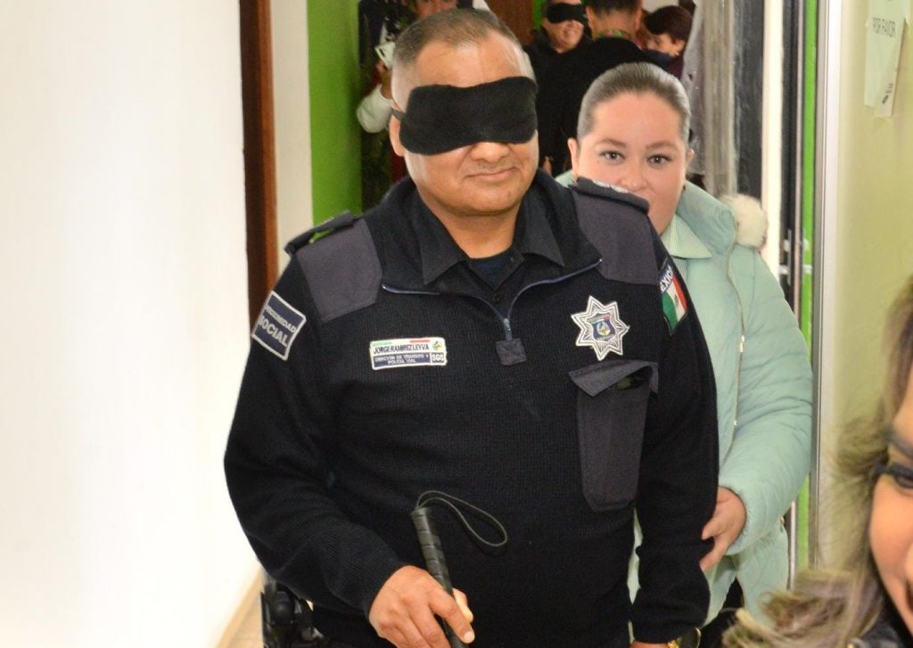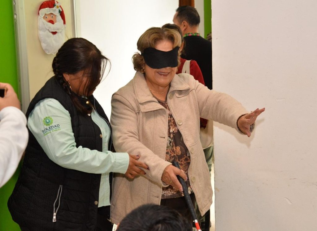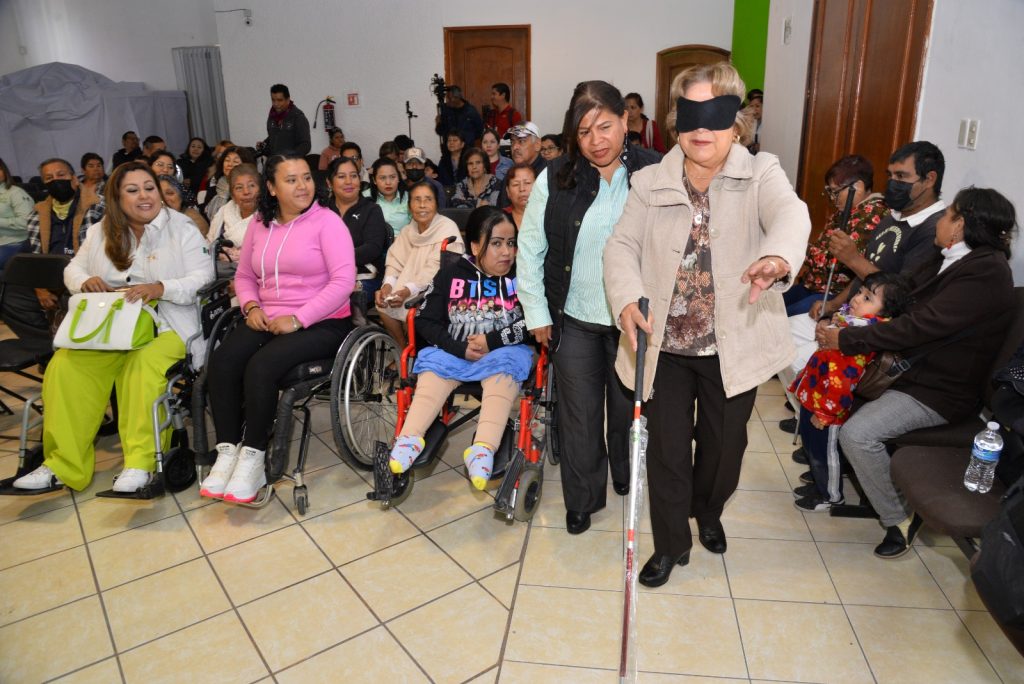 Entre las actividades, se brindó a las y los asistentes la oportunidad de experimentar la discapacidad visual para generar conciencia sobre las dificultades diarias que enfrenta este grupo poblacional, para ello se les taparon los ojos y se les facilitó un bastón que usaron como guía para desplazarse en el edificio. También fueron entregados apoyos funcionales a beneficiarios del DIF municipal y Unidades Básicas de Rehabilitación.