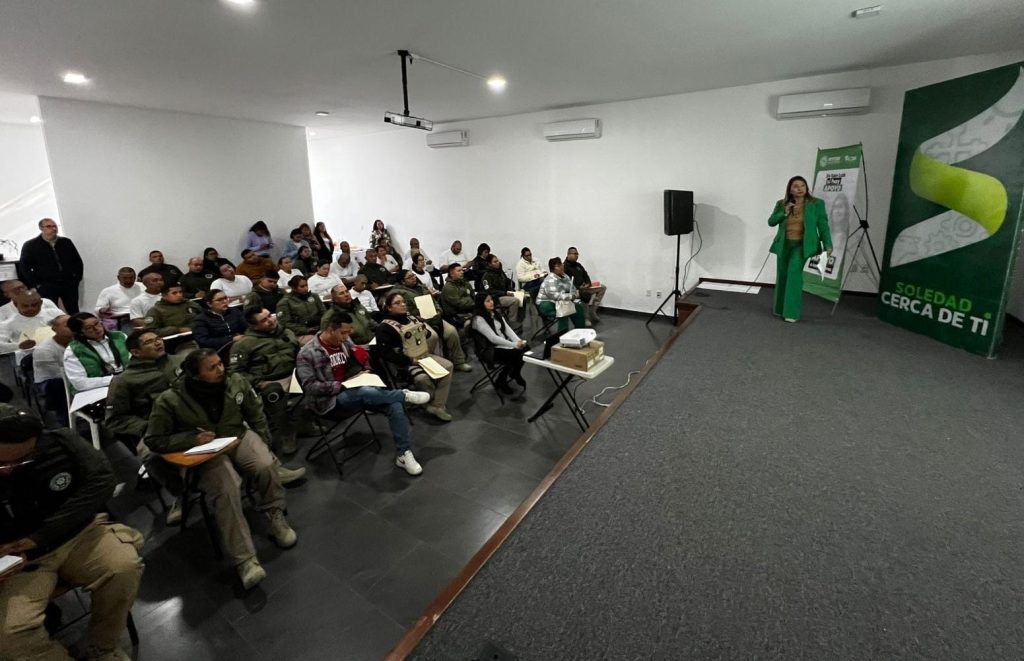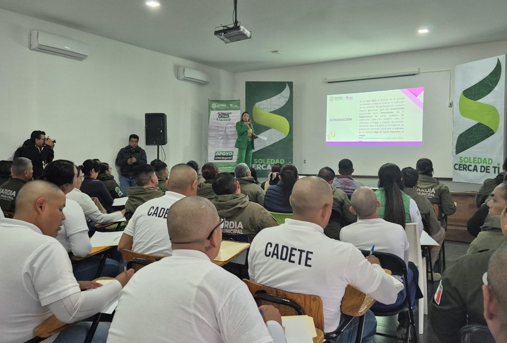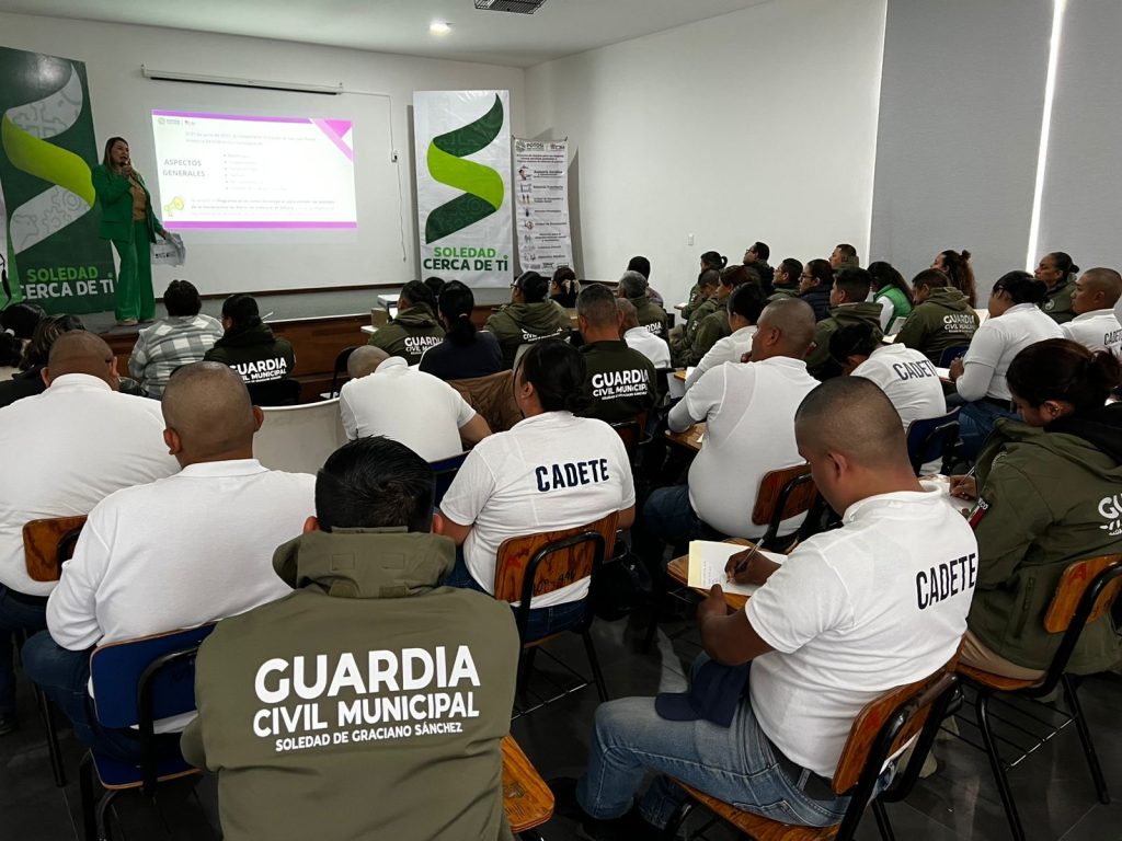 En aras de fortalecer los conocimientos y dotar de herramientas a las y los agentes operativos, para brindar una mejor atención a los sectores vulnerables de la sociedad, personal de la Guardia Civil Municipal de Soledad de Graciano Sánchez recibió un taller de capacitación en el tema «Órdenes de Protección para Mujeres y Menores», organizado por la Coordinación Municipal de Derechos Humanos, e impartido por la titular del Centro de Justicia para Mujeres del Estado, Mónica Kemp Zamudio.