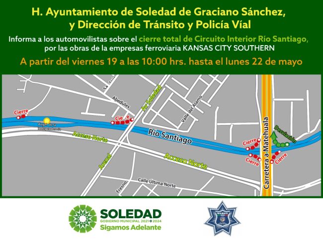 La Dirección de Tránsito y Policía Vial de Soledad de Graciano Sánchez, informa que a partir de las 10 de la mañana de este viernes 19 y hasta las 00:00 horas del lunes 22 de mayo, el bulevar Río Santiago mantendrá cerrado el acceso vial, tanto en sus ramales de ingreso como de descenso, debido a maniobras de ensamblado de estructuras que lleva a cabo la empresa Kansas City sobre el que cruza el también llamado Circuito Interior.