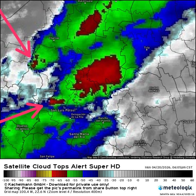 Se continuará con el potencial de tormentas fuertes y granizo en la región, durantes las próximas horas. Así mismo con alta probabilidad en Zona Centro y su área Metropolitana principalmente en Soledad de Graciano Sánchez y San Luis Potosí.
