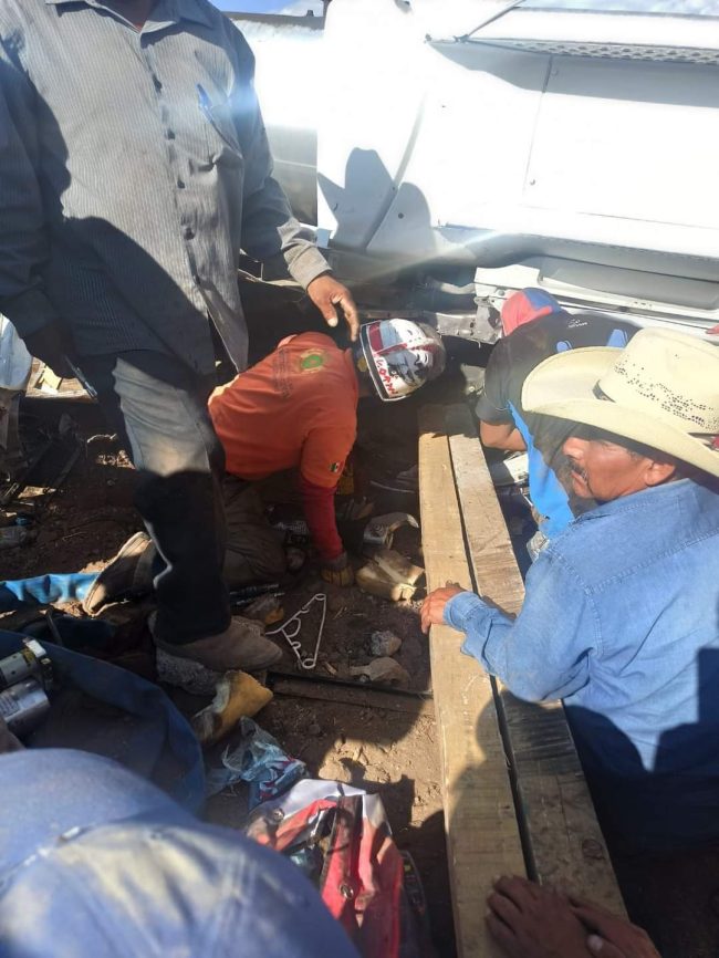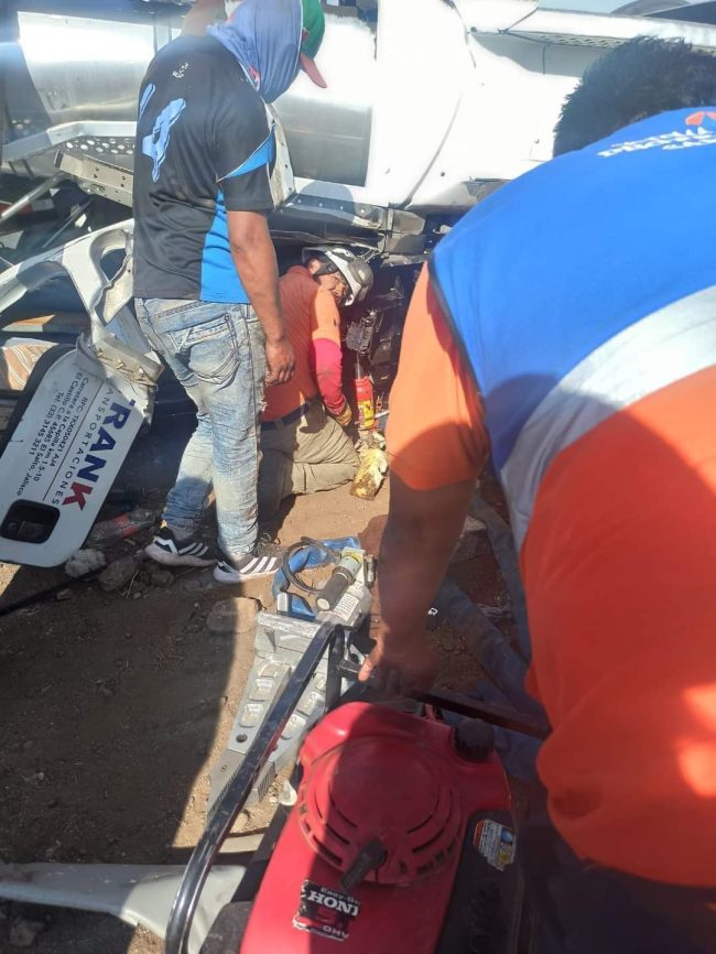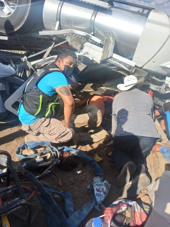 En el lugar se encontró un trailer con plataforma cargado con varilla, volteado y en su interior, una persona del sexo masculino, de 46 años, consciente, bien orientado, atrapado de miembros inferiores.