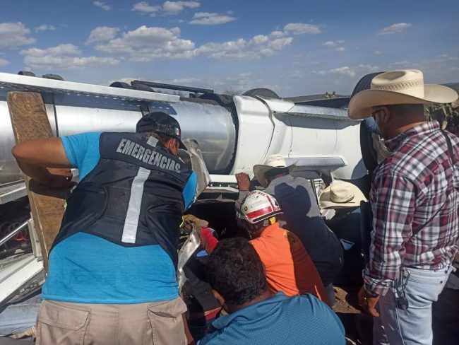 DE MILAGRO RESCATAN CON VIDA A TRAILERO QUE QUEDÓ PRENSADO AL VOLCAR SU VEHÍCULO EN LIBRAMIENTO SLP-VILLA DE ARRIAGA