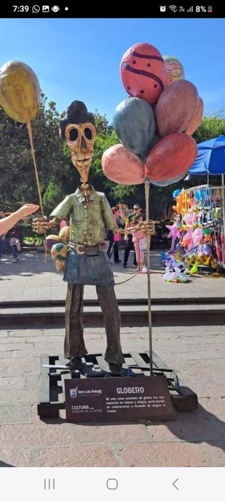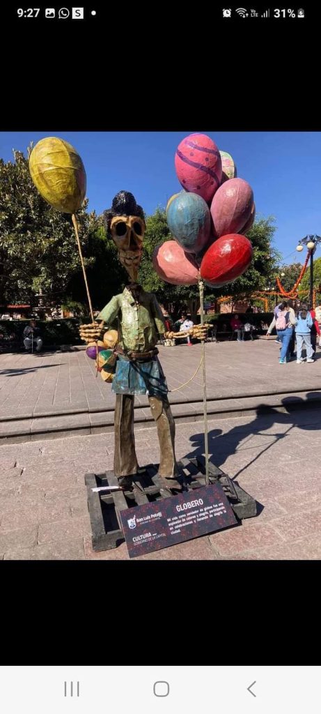 “El Globero” 🎈, formó parte de la exposición de Calaveras Monumentales » en memoria de los potosinos», que fue instalada en la plaza de armas con motivo del Día de Muertos, gracias a la iniciativa de la Dirección de Cultura del Gobierno Municipal.